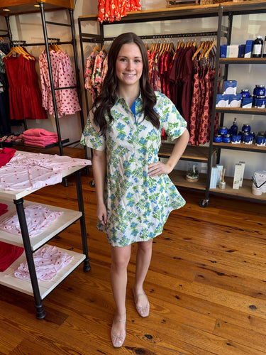 Floral print short sleeve mini dress featuring spread collar and hidden button closure at front. Side pockets. Lined. Woven. Non-sheer. Lightweight.