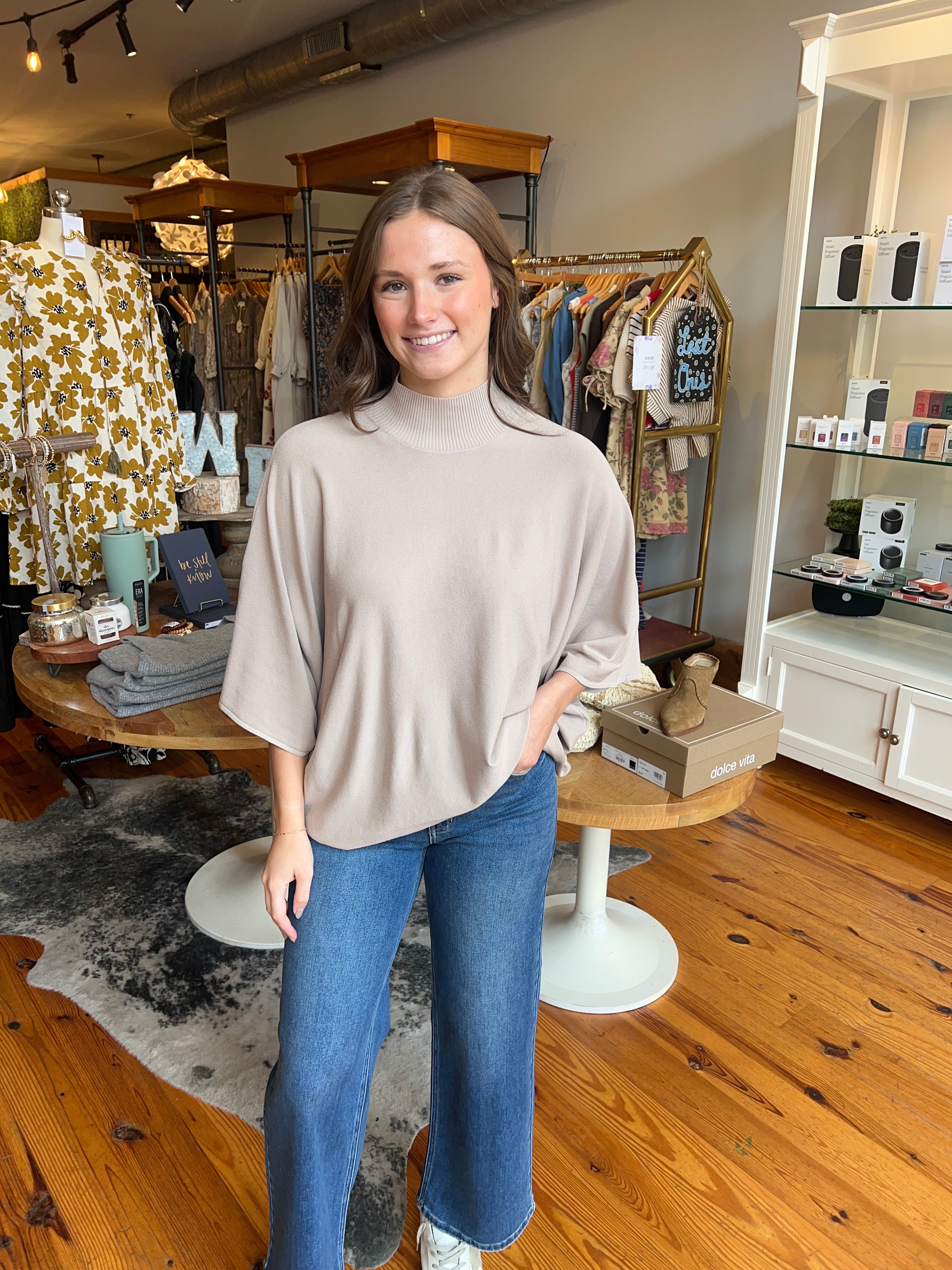 Solid mock neck 3/4 sleeve knit top featuring relaxed silhouette. Unlined. Knit. Non-sheer. Lightweight.