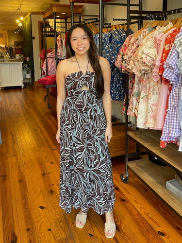 This floral maxi dress features a crinkle georgette fabric, adjustable halter ties, and an elastic back to ensure a great fit.