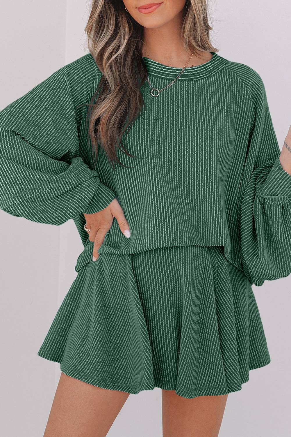 LDC Corded Lantern Sleeve Top High Waist Ruffled Mini Skirt