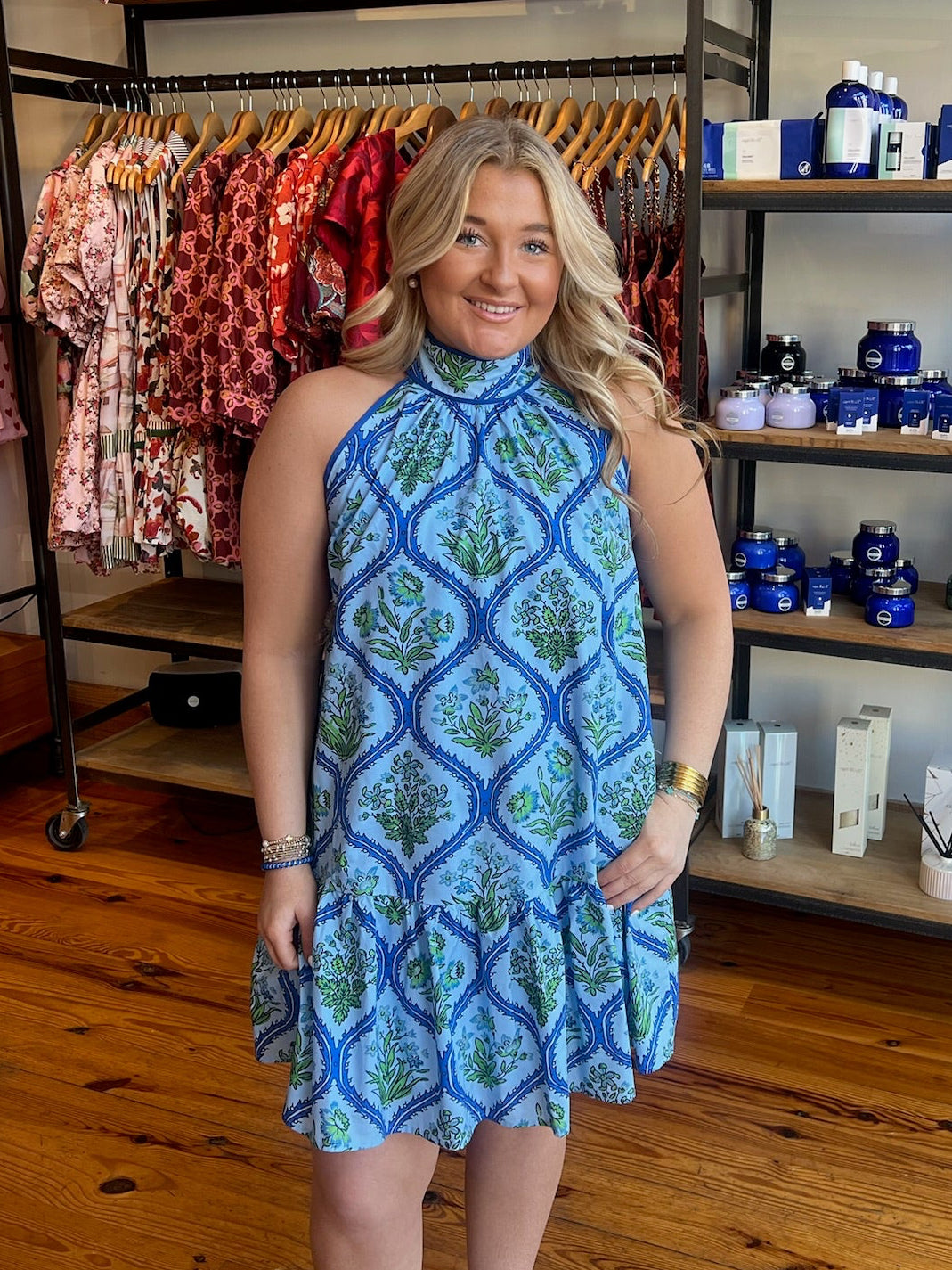 Botanical print sleeveless mini dress featuring halter neckline with self-tie bow at back. Ruffle hem. Side pockets. Lined. Woven. Non-sheer. Lightweight.