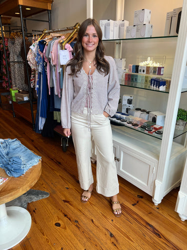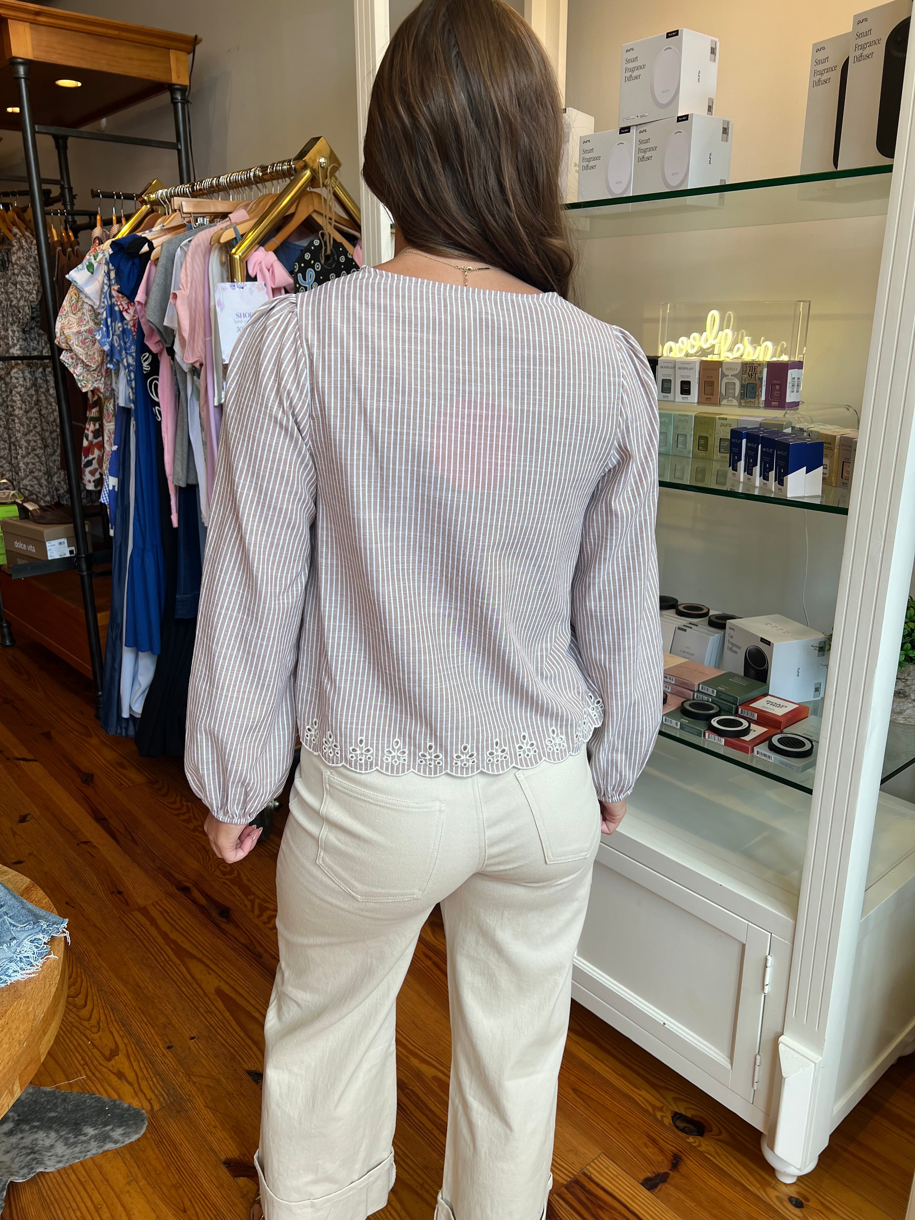 Long Sleeve V-neck Scallop Embroidered Top with Front Tie