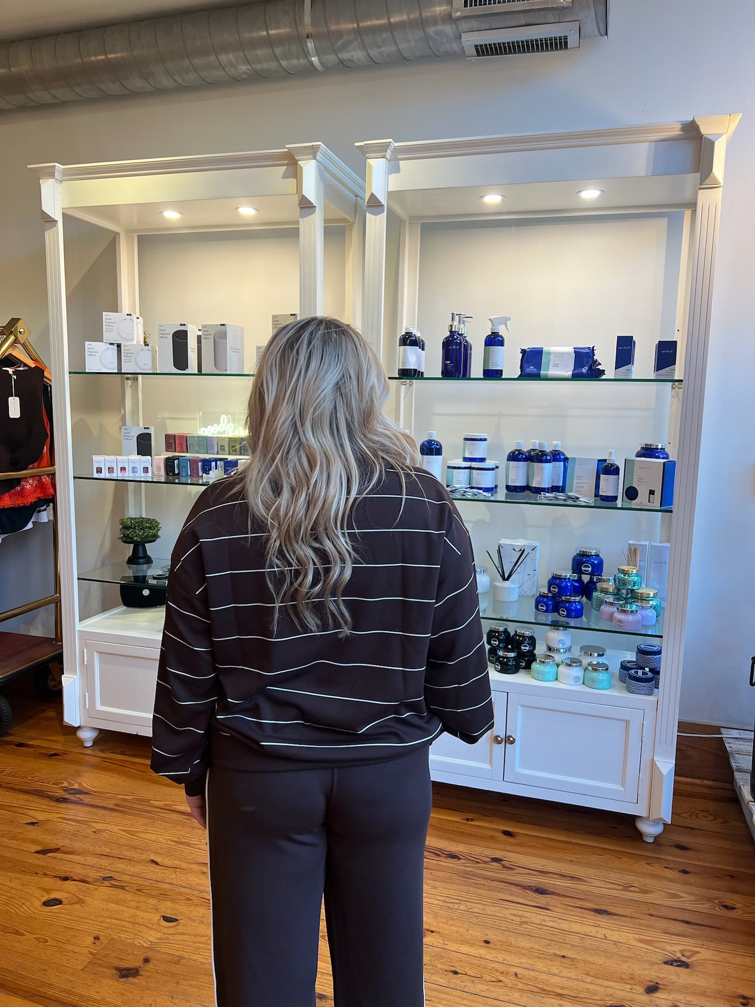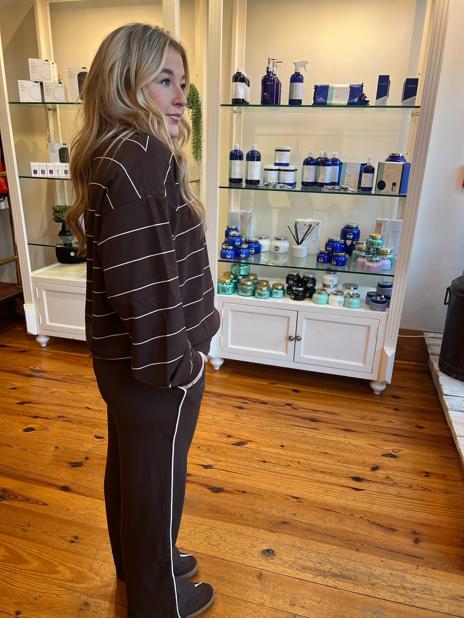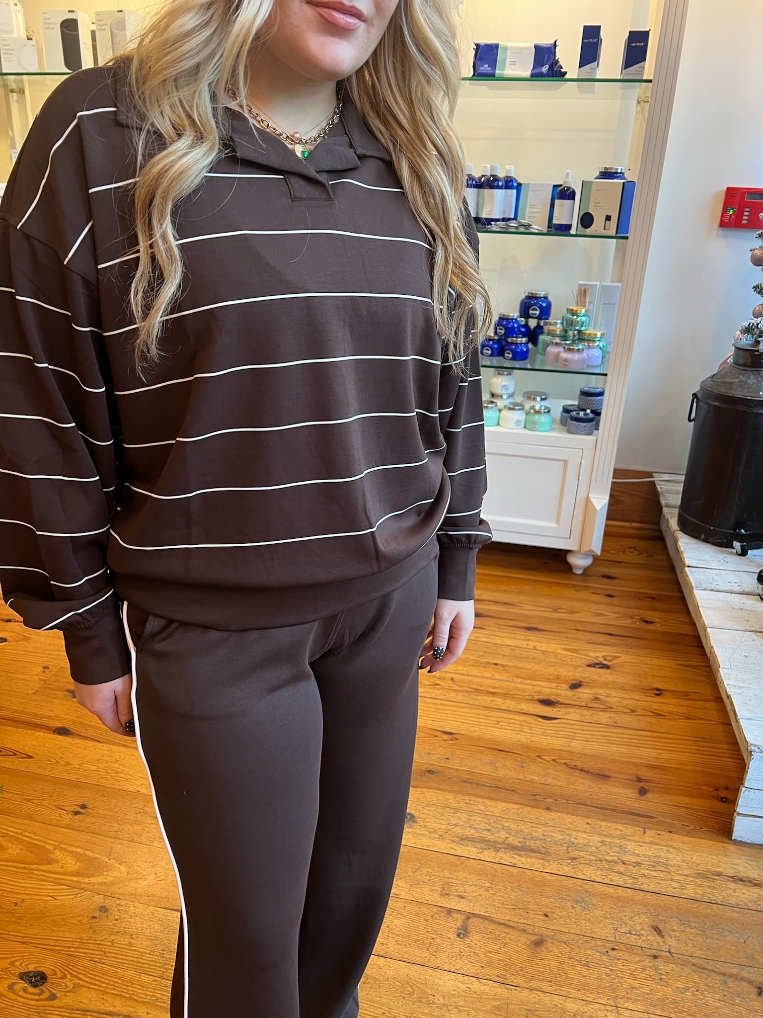 Elevate your everyday look with this striped polo top and straight pants, crafted from silky smooth fabric. Lightweight, breathable, cooling, and soft to the touch, it offers all-day comfort with a refined silhouette. Featuring a classic collar and clean stripe pattern, it's perfect for both casual and polished outfits. Pants have piping details tht offer a luxurious yet sporty look, perfect for both comfort and sophistication.