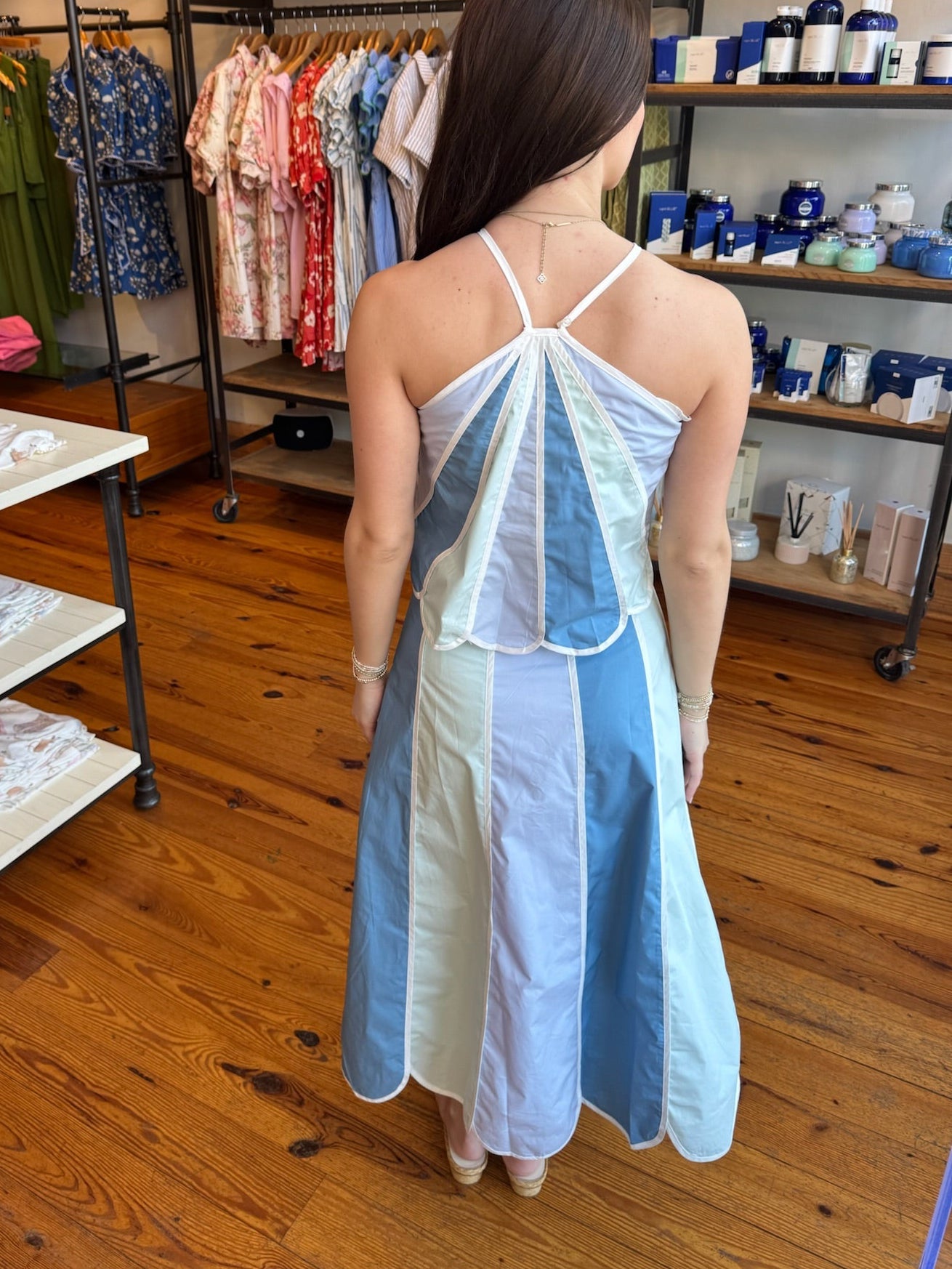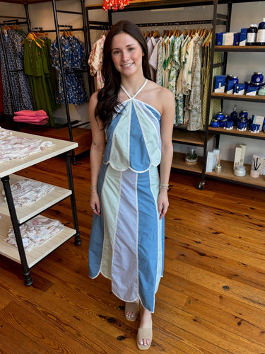 A color-block halter top featuring paneled detailing with scalloped edges. Designed with a flowy, relaxed silhouette and a gathered neckline. Midi skirt features a paneled design with scalloped edges. Designed with a flowy A-line silhouette and a clean waistband. Finished with a side zipper closure.