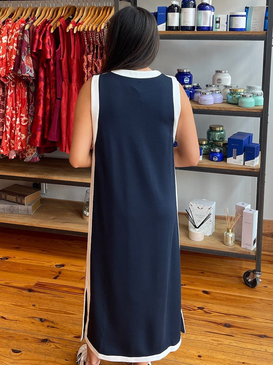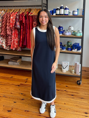 Solid sleeveless midi dress featuring contrast binding along neckline, armholes, and hem. Side slit at hem. Unlined. Knit. Non-sheer. Lightweight.
