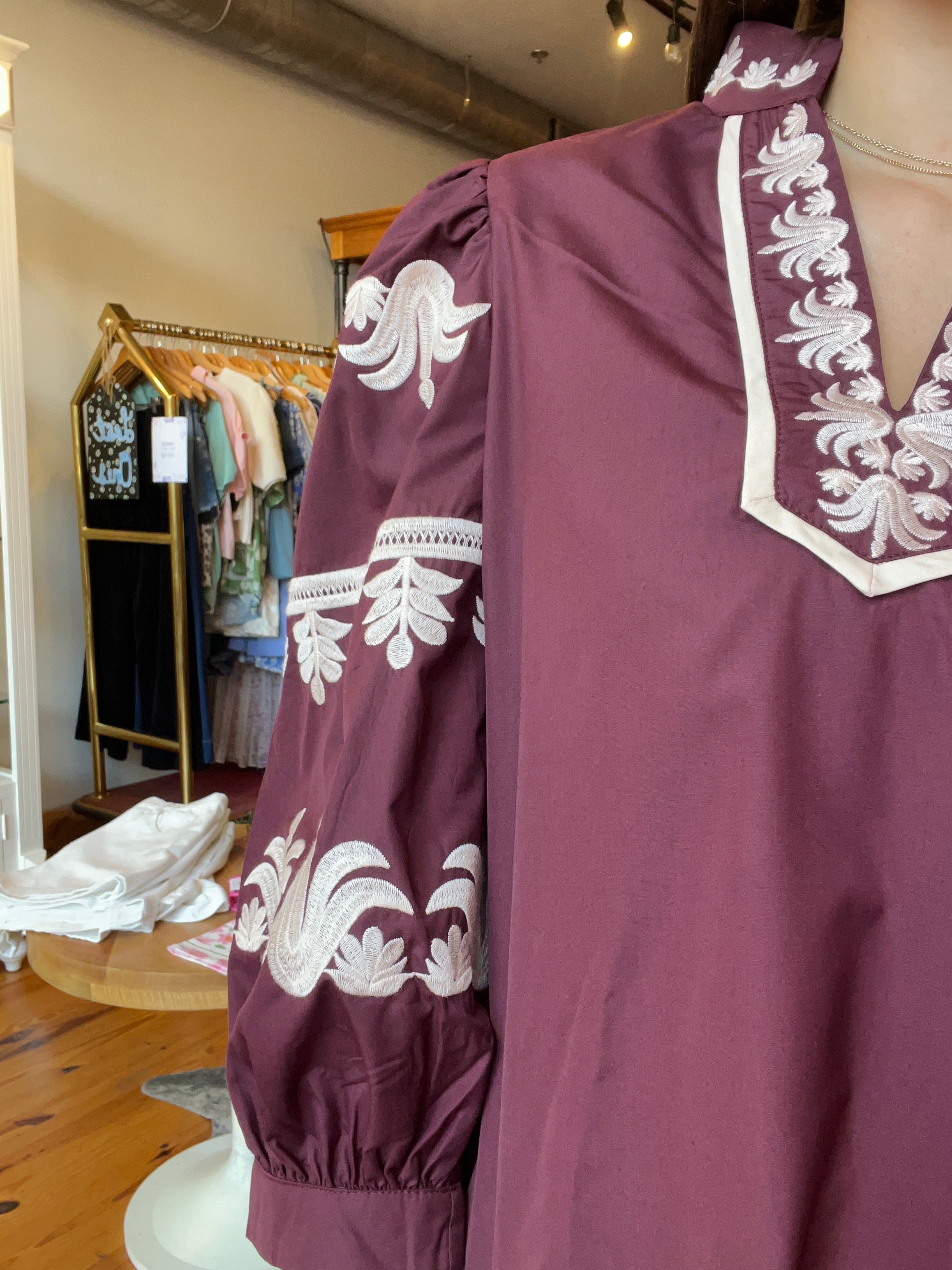 Solid 3/4 puff sleeve mini dress with gathered sleeve openings featuring contrast embroidery along split neckline, collar and sleeves. Side pockets. Lined. Woven. Non-sheer. Lightweight.