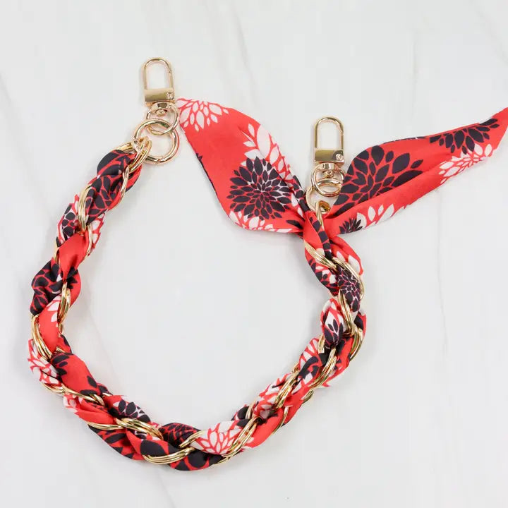 Elevate your accessory game with the Serafina Scarf Purse Chain in a beautiful Black and Red Floral print. Featuring a chic gold link chain intertwined with a stylish printed scarf, this piece effortlessly combines school spirit with sophisticated fashion. Perfect for adding a refined yet spirited touch to your favorite handbag.