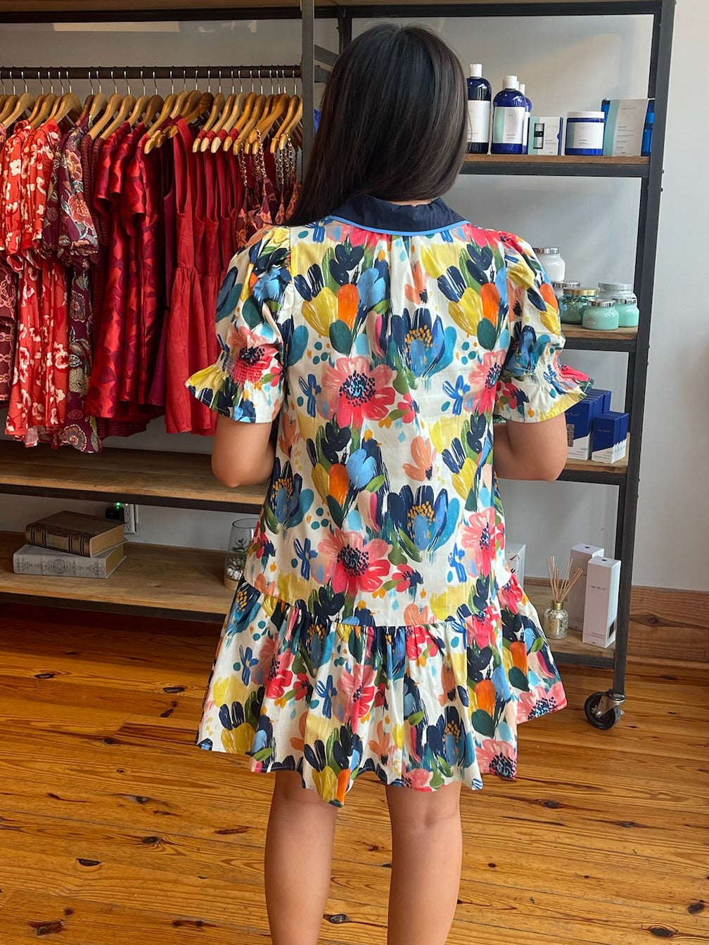 Floral print short puff sleeve mini dress featuring contrast V-neck detail and ruffle hem. Side pockets. Lined. Woven. Non-sheer. Lightweight.