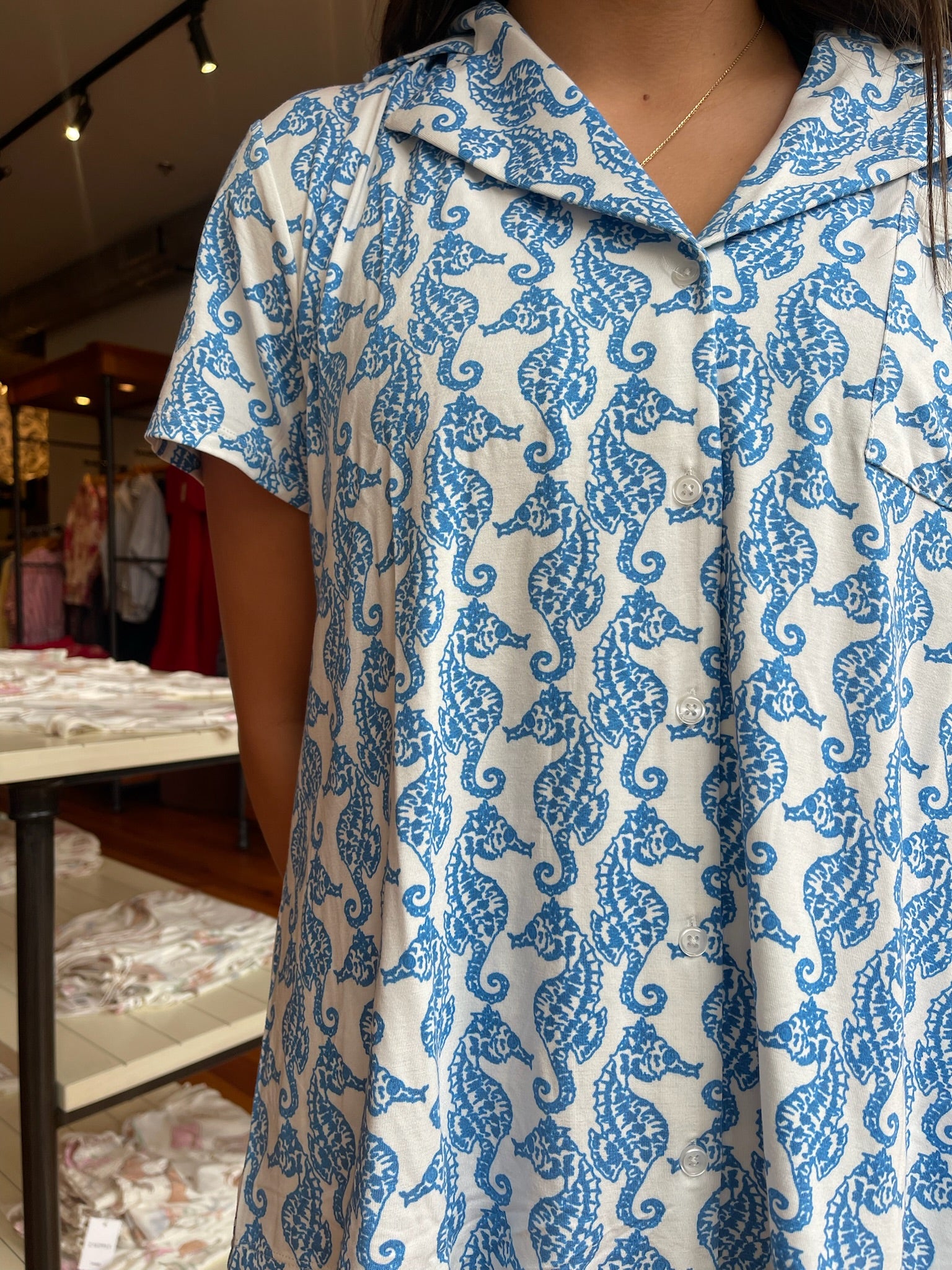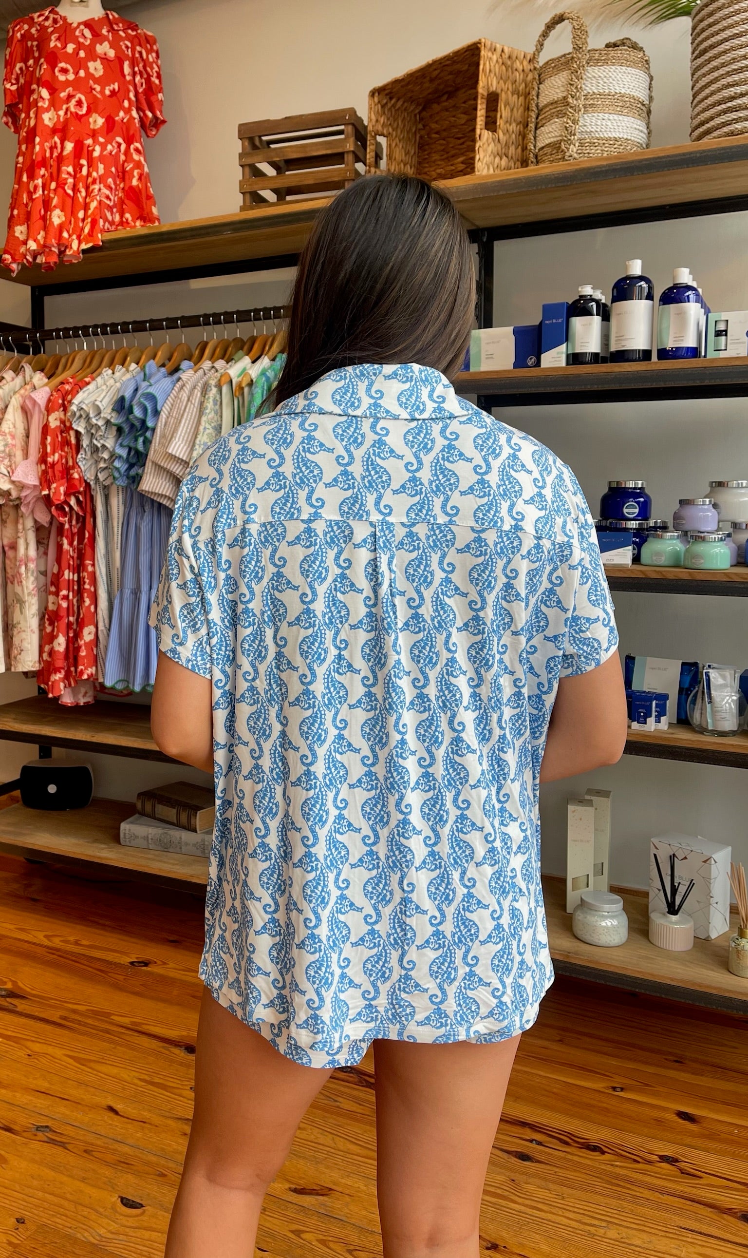 Easy like Sunday morning! This vibrant seahorse printed PJ set makes it easy to sleep in all weekend long. This set has a button down top and elastic waist shorts. Throw on a pair of your fave slippers and you'll be ready to snuggle up!